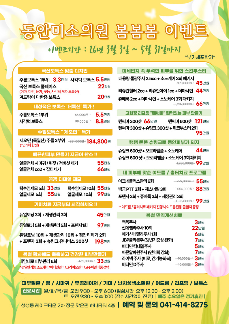 동안미소의원은 섬세한 맞춤 케어로여러분의 피부 건강과 아름다움을 함께합니다.